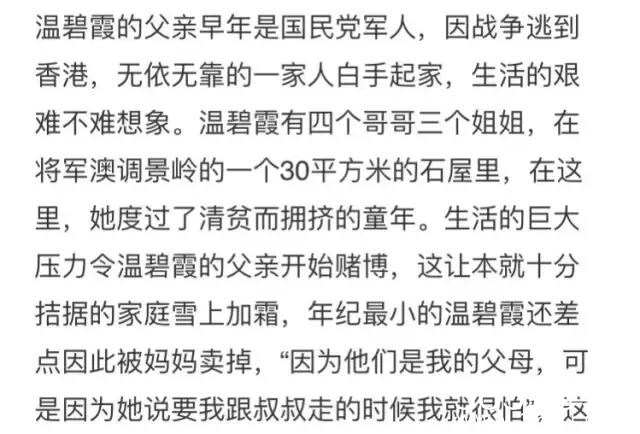 温碧霞身世坎坷,父母用微薄的工薪养育八个儿女,家里入不敷出,险些把她卖掉换钱。