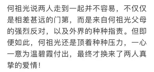 温碧霞在每次接受访问过程中都对丈夫的评价很高,何祖光永远做她的后盾,让她可以随心做自己喜欢的事情。