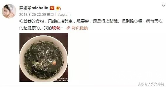 陈妍希曾经因为小圆脸被大家称作小笼包,光看脸就知道她爱吃啦,但是为了减肥,陈妍希的减肥餐也是够狠!