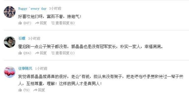 而嫁入豪门后的郭晶晶不炫富,不高调,节俭持家,因此有人说她是最安静的豪门阔太。她曾因头上便宜的头绳以及朴素的衣服受到媒体以及大众的赞扬。