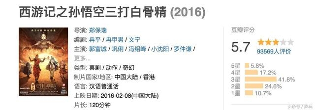 同是大年初一上的郭富城版《三打白骨精》,评分5.7。万合天宜的电影《万万没想到之西游篇》,姑且也算作西游主题,评分也是5.6。