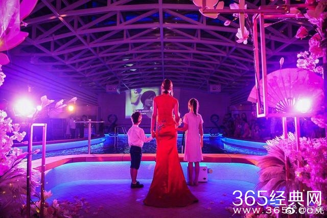 照片中,叶一茜以一身中式旗袍亮相,一对儿女站在身边。
