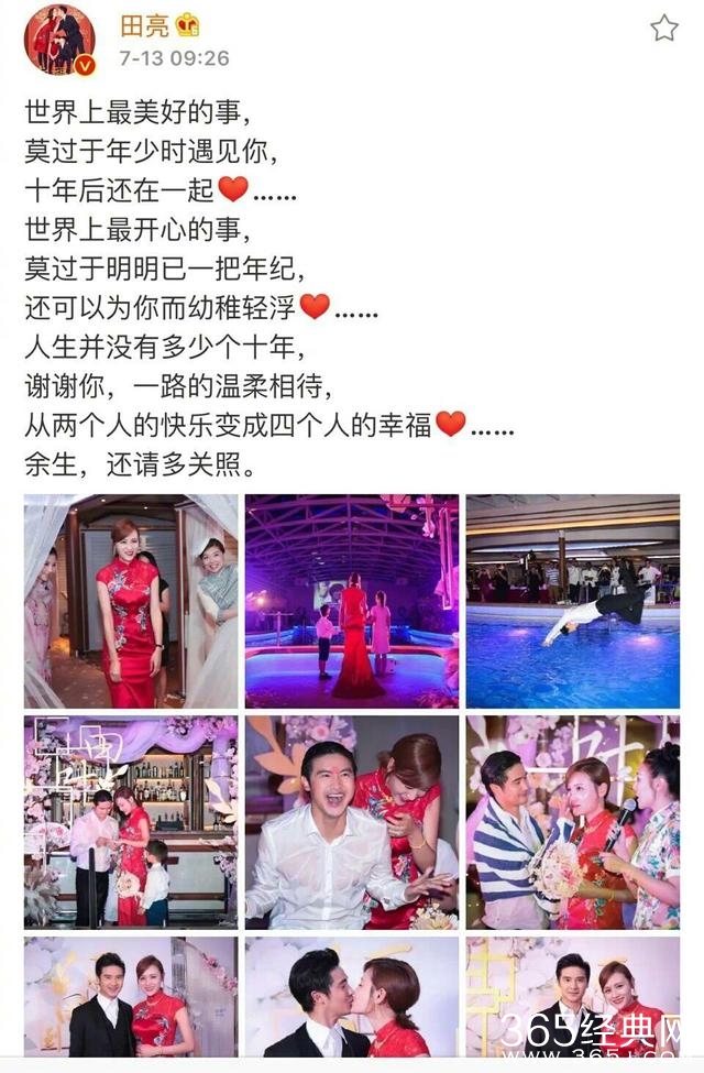 今日,田亮在微博晒出结婚纪念日现场图,并表白妻子:“世界上最美好的事,莫过于年少时遇见你,十年后还在一起。”