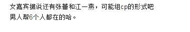 有人说节目组可能有组成6V6凑CP的想法,一对一对做任务之类的。