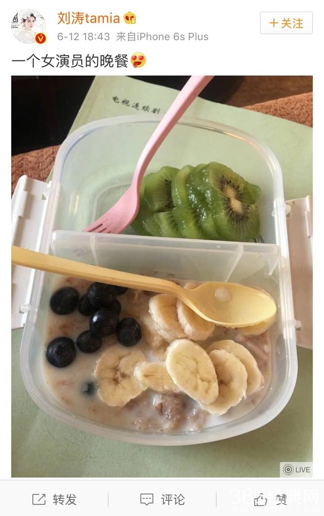 刘涛微博晒出了一个女演员的晚餐:一颗猕猴桃、加了半根香蕉和几颗蓝莓的燕麦片,且不说看着就让人毫无食欲,这根本就吃不饱啊!
