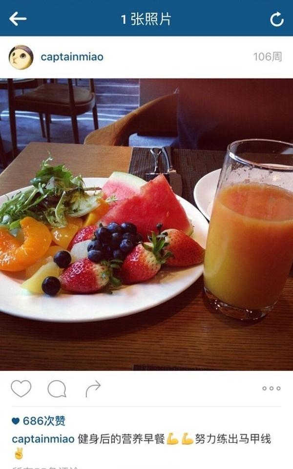 印象中,倪妮一直是娱乐圈偏瘦女生的代表,没想到她也在为练出马甲线努力着:水果拼盘,果汁