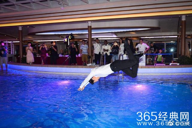 田亮嘛,黑西裤,白衬衫,直接往泳池里跳,动作上不能要求田亮要像当年比赛时候那么严格,博美人一笑便好。