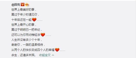 世界上最美好的事,莫过于年少时遇见你,十年后还在一起……世界上最开心的事,莫过于明明已一把年纪,还可以为你而幼稚轻浮……人生并没有多少个十年,谢谢你,一路的温柔相待,从两个人的快乐变成四个人的幸福……余生,还请多关照。