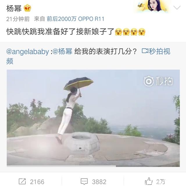 不过杨幂倒是非常巧妙的躲过了这个问题,转发并说:快跳快跳,我准备好节新娘子了!后边儿跟着的小人真是眼冒金星,各种期待呀!被叫新娘子,相信baby的心情也是不错的。杨幂又一次机智地避免了打分的尴尬,为其点赞!