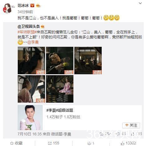 范冰冰看到后,转发这条微博,还称自己不是江山、也不是美人,只是一颗葡萄,紧接着一连四个感叹号,把自己比作李晨爱吃的葡萄,不少网友看到觉得有点污。