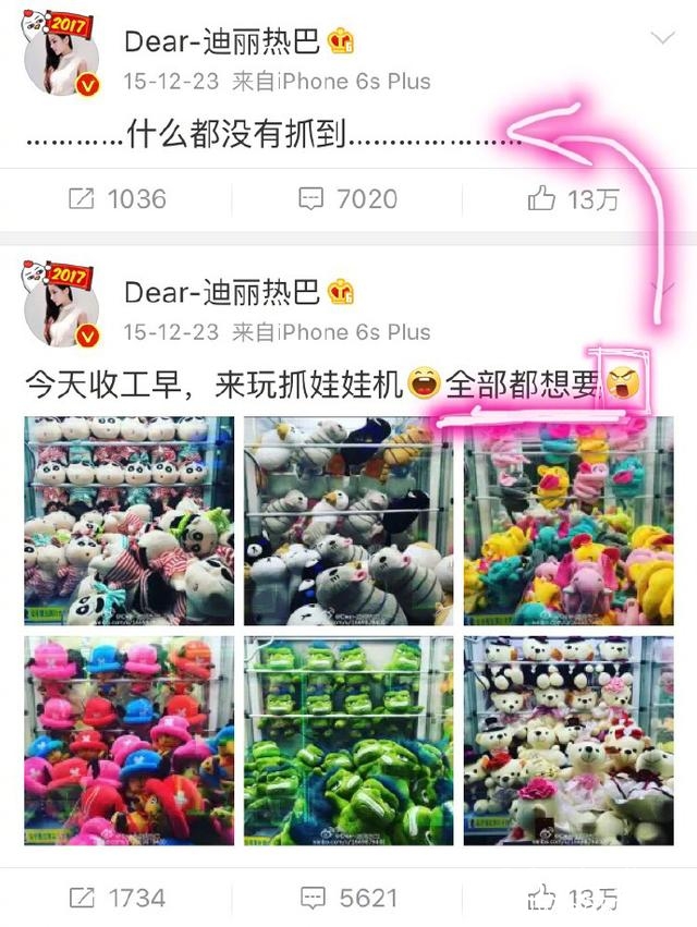 不过,热巴抓娃娃还真的是情绪转化太快,开始时还是兴高采烈快要跳起来,没抓到就一点沮丧...还发微博抱怨..