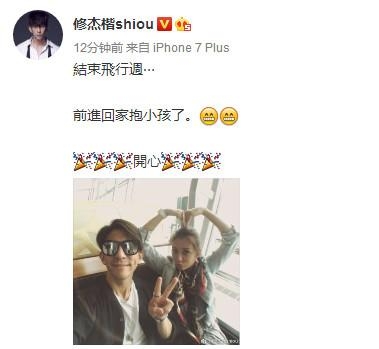 “结束飞行周,前进回家抱小孩了,开心”修杰楷微博中写道,字里行间都表露出了对女儿咘咘和Bo妞的思念之情。