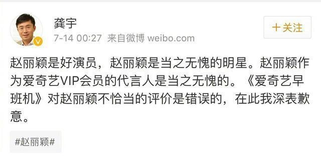 一条表示了自己的歉意,“赵丽颖是好演员,赵丽颖是当之无愧的明星。赵丽颖作为爱奇艺VIP会员的代言人是当之无愧的。《爱奇艺早班机》对赵丽颖不恰当的评价是错误的,在此我深表歉意。粉丝们在CEO底下也很诚恳,一是希望的是《早班机》小编的道歉。粉丝只是想要公道,而不是以胁迫的名义。不希望自己的爱豆受到无故造谣,粉丝们不是无理取闹的团体