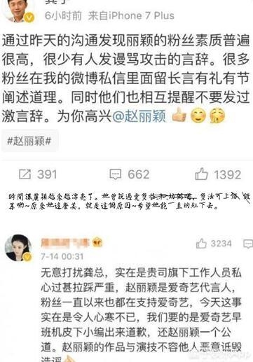 赵丽颖作为爱奇艺的代言人,被爱奇艺的节目这么黑,粉丝看了之后要爱奇艺给个说法。最后爱奇艺的CEO龚宇也亲自出来道歉,CEO称:赵丽颖是好演员,赵丽颖是当之无愧的明星,赵丽颖作为爱奇艺VIP会员的代言人是当之无愧的。《爱奇艺早班机》对赵丽颖不恰当的评价是错误的。