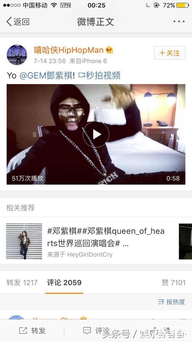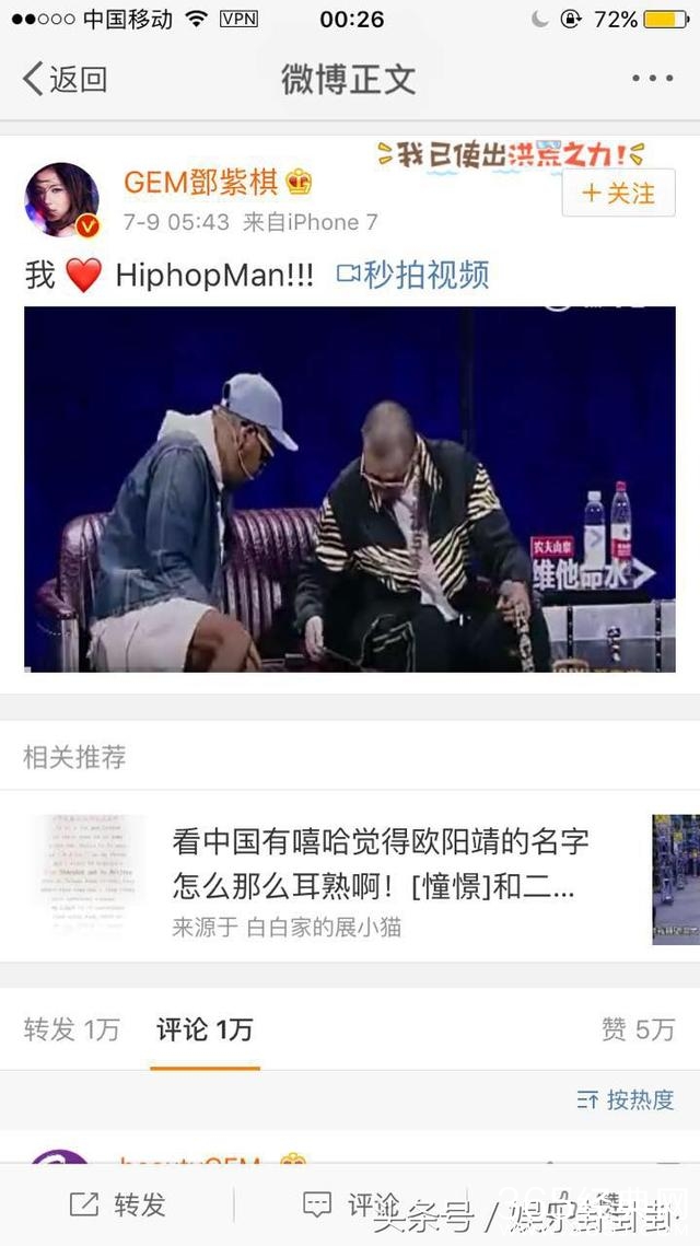 而恰恰就在前两天嘻哈侠更在微博中说出自己喜欢的女歌手是邓紫棋,随即播放了一首最喜欢的歌曲Wheredid you go并跟着唱起来