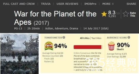 导演马特·里夫斯赋予了《猩球崛起3:终极之战》众多类型片的元素,科幻、战争、亲情、信仰、人性等等,包罗万象无所不有,烂番茄新鲜度保持在94%,IMDB评分8.3,MTC均分83,高口碑的开局。