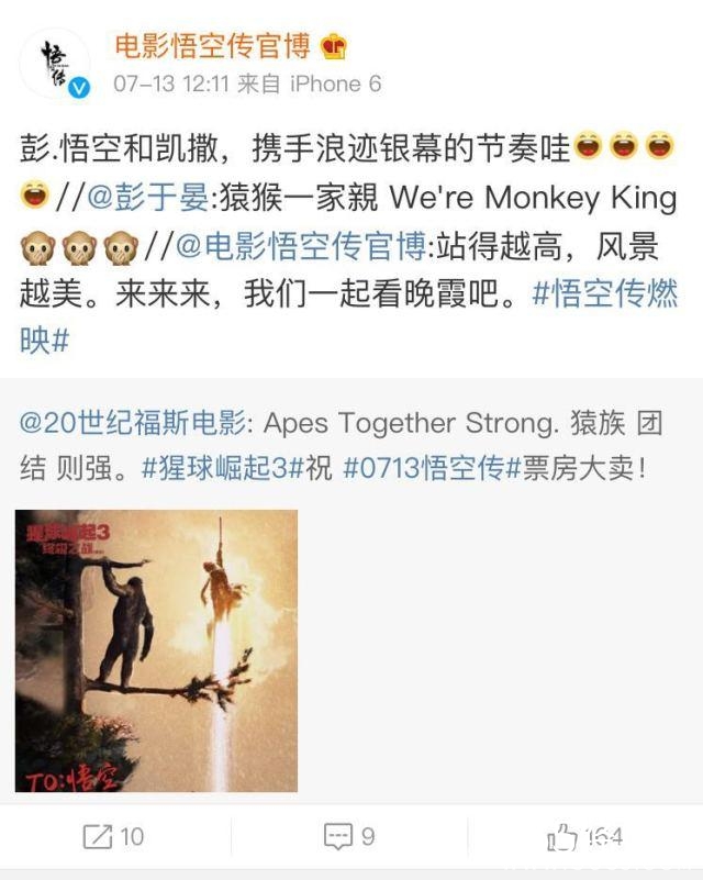 国内的猴子国外的猩猩在大银幕上无缘相见,戏外《猩球崛起3:终极之战》的电影发行公司20世纪福斯电影祝福《悟空传》大卖,彭于晏和《悟空传》的官博也热情回应。