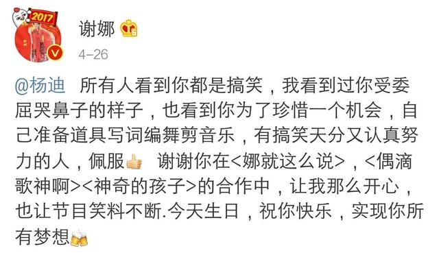 谢娜在旁边听到后说:杨迪我一定帮你。