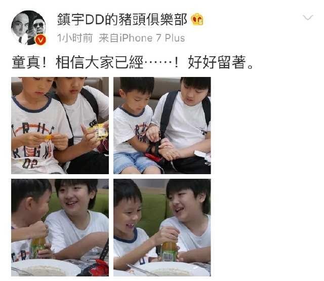 7月16日晚,吴镇宇在微博发出几张儿子与小朋友一起玩耍的照片,并配文感叹:“童真!相信大家已經⋯⋯!好好留著”。