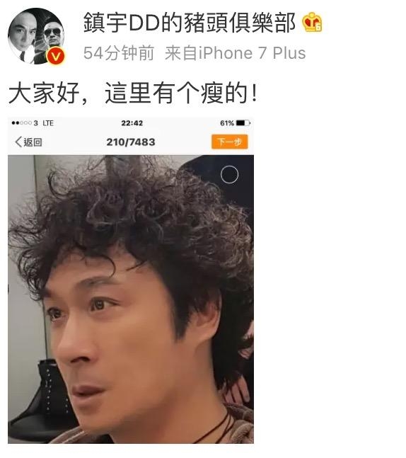 微博发出没多久吴镇宇又发了一张自己的照片,配文:“大家好,这里有个瘦的”,不愧是吴三岁,就这样直接怼了回去!