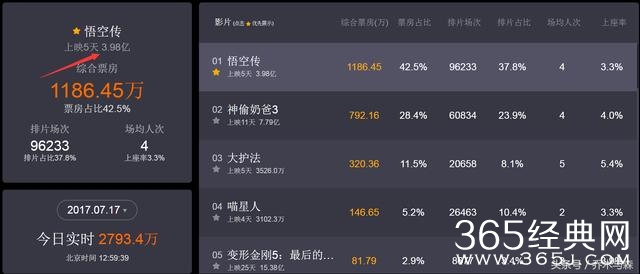值得一提的是,刚刚上映的《悟空传》和《西游记之女儿国》也是类似题材,《悟空传》上映5天,票房仅仅达到了3.98亿。约为《变形金刚5》的四分之一。但还是7月份目前国产电影里票房最好的。可能《战狼2》和《建军大业》会超越《悟空传》。