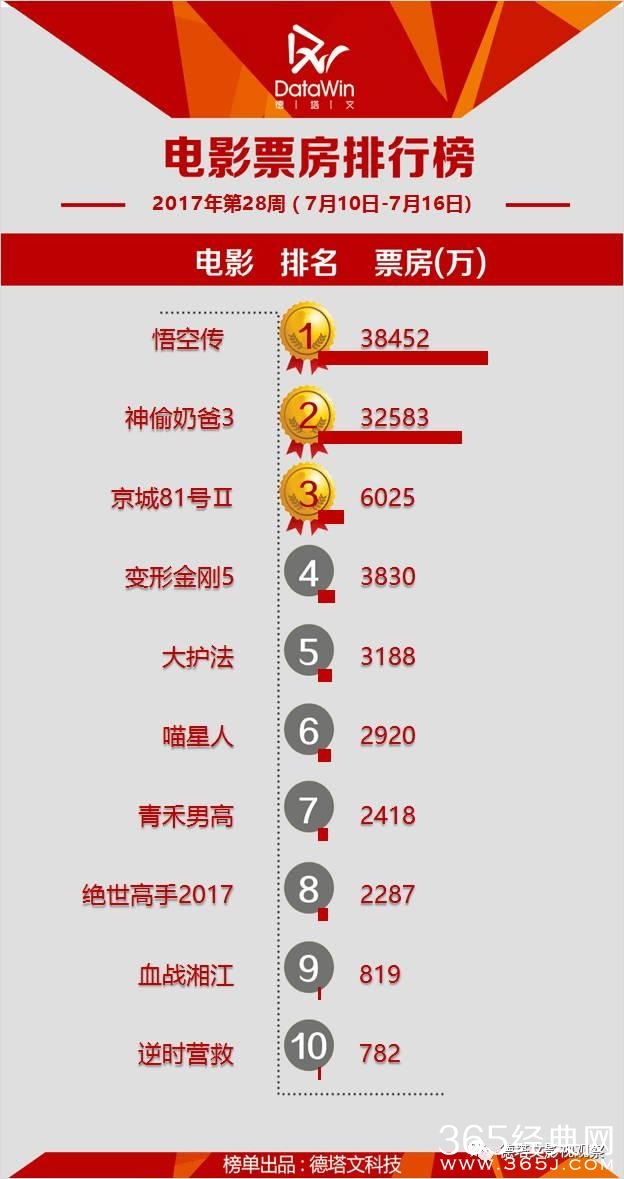 近期最受期待的国产影片《悟空传》顺利拿下该周票房冠军,首周末3.8亿元,在近月国产电影中算是出色的表现了。好莱坞小黄人《神偷奶爸3》第二周获3.25亿票房荣登第二;国产恐怖电影《京城81号2》同样第二周,拿下6025万票房获第三名。国产动画影片《大护法》首周仅获得三千余万票房表现一般,该片虽然口碑相当不错,但接下来的档期排片竞争激烈,靠口碑强势逆袭的路并不算好走。
