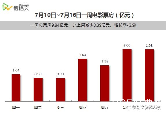 暑期第二周,大盘反而出现微量下滑,由上周的破10亿下降到9.84亿,微降0.38亿元。《悟空传》周四上映带动了当日大盘,周末两日又持续发力,首周成绩亮眼,但除此之外,电影市场整体热度一般。