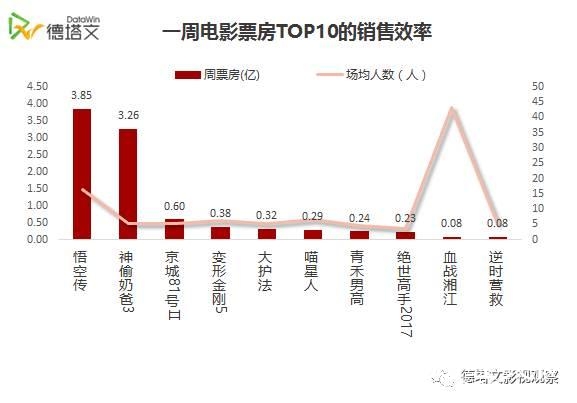 本周销售效率最高影片为《悟空传》,平均票价仅为《神偷奶爸3》的一半,但场均票房依然超过,场均人数16人优势明显。《神偷奶爸3》第二周场均人数急跌,票价太贵、忠粉人数不足可能是原因。