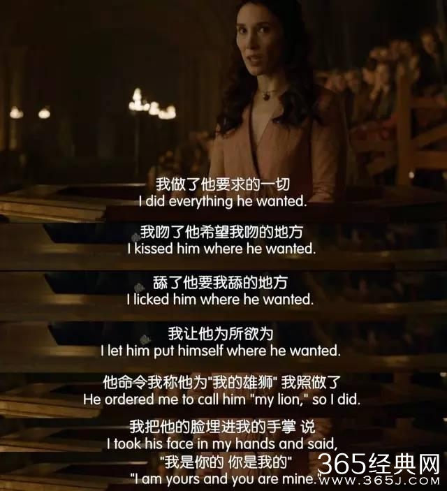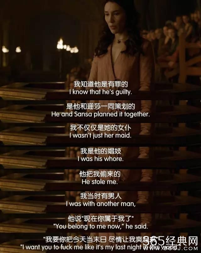 她还哽咽着叙述了提利昂如何强迫自己做他的情妇,强迫她与之发生关系的过程。