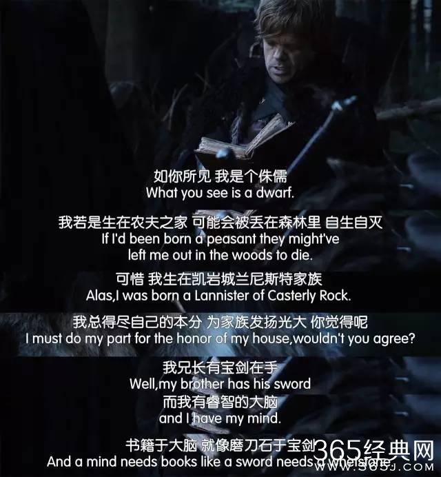 因此,他选择用聪明的头脑来补全身体上的残缺,他博览群书,虚心向有学问的人请教,当被问到为什么总是看书时,他回答说,“我生在凯岩城兰尼斯特家族,总得为家族的荣誉做点贡献。我清楚地知道自己的长处和短处在哪里,老哥有他的宝剑,国王有他的战斧,我则有我的大脑。好脑筋需要书本,如同宝剑需要磨刀石。”