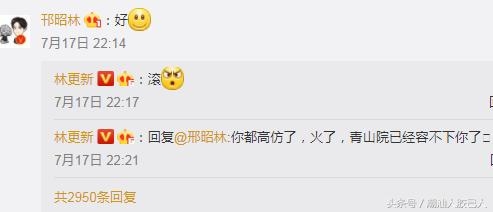 隔三分钟后林更新回复他:滚(怒气)这似乎还是第一个被明星回复的高仿号呢~随后,林更新@真正的邢昭林,调侃他你都高仿了,火了,青山院已经容不下你了!曝光20明星大尺度床戏 真实堪比不雅视频图