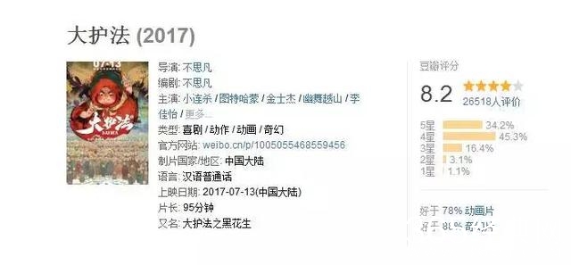7月13日上映,至今不过3天,《大护法》的豆瓣评分已经由原来的7.4升到了8.2分,号称豆瓣年度国产电影评分Top1。足足甩了前一周上映的《神偷奶爸3》1.2分。