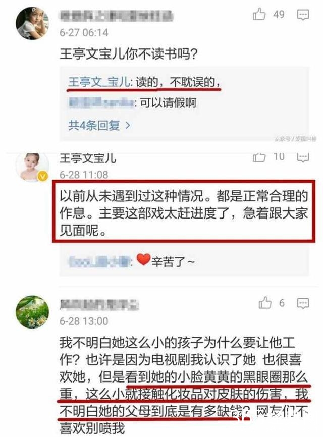 而对于这一切的质疑声,王亭文的父母也给出了答复:说学业不耽误,化妆品一直用的是儿童专用的,太累,是因为剧组赶进度,到了这里就要守规矩!可以听出,王亭文的父母是气愤的!