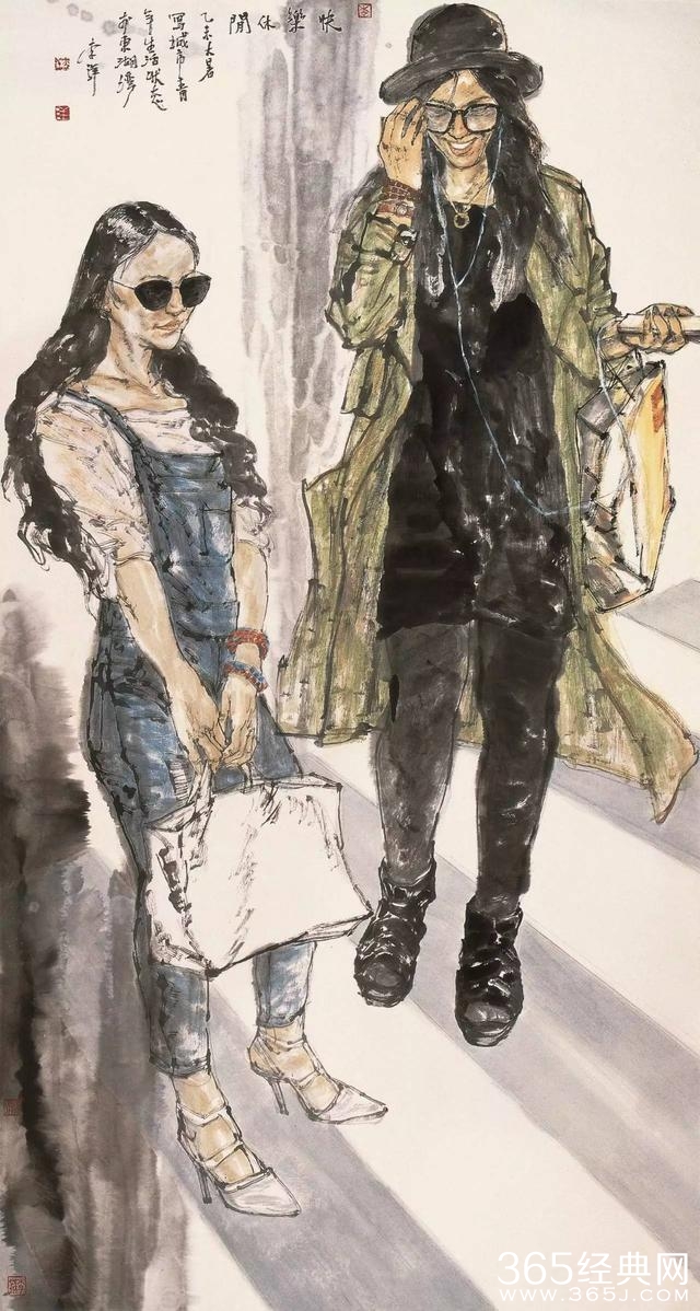 在表达都市人物和时尚生活这一新的主题中,他调动了具有现代形式感的笔墨语言,从笔线、水墨、晕染和色彩运用等方面形成了具有都市文化气息的意境,由此传达出五彩斑斓的都市生活景象和富有个性的青年形象。