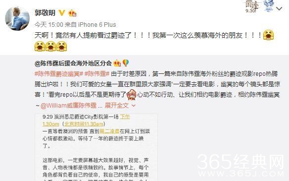 据提前观影的郭敬明铁杆粉丝传来的消息称,这部电影一定要屏幕越大效果越好,视觉、声音、人物表情都是很精致的。故事情节上,每个人都背负着自己的使命(想笑)。并且告知,一定要用心看,一定要跟着故事走,体会每一个人想表达的情感。郭敬明导演欣喜转发这位粉丝的微博,让我对《爵迹》的预感更加模糊了。