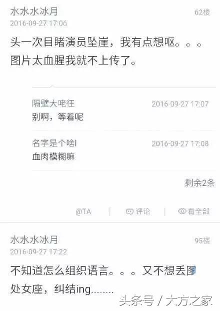 微博账号名为“八哥专用”的博主爆料称,G姓女演员坠崖的消息从天涯传出,而天涯这位爆料的博主名为“水水水冰月”,对方表示“头一次目睹演员坠崖,我有点想吐。