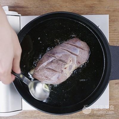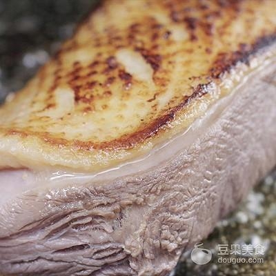 5、持续动作直到翻面,此时鸭皮成焦黄色,把鸭肉朝下,略煎一会儿就好;