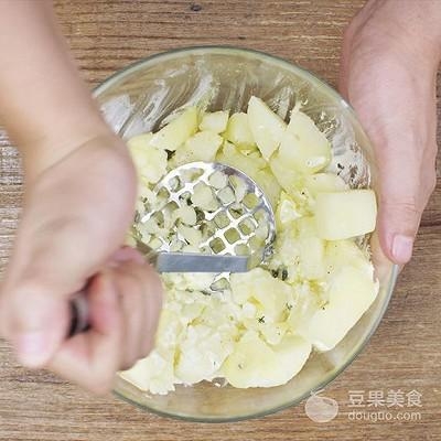 3、然后做配菜土豆泥,在煮熟的土豆里加入淡奶油、盐、糖、黑胡椒碎、橄榄油、百里香碎,捣碎成泥,拌匀待用;