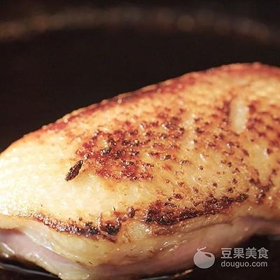 4、开小火,将鸭皮朝下放入铸铁锅中,慢煎,直至鸭油析出,舀少许鸭油淋在鸭肉上催熟;