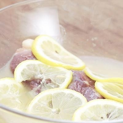 2、鸭胸加盐、糖、柠檬汁、柠檬片抓拌,冷藏腌渍4个小时;