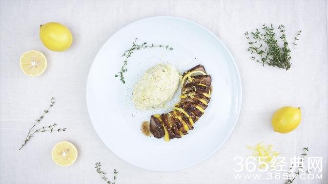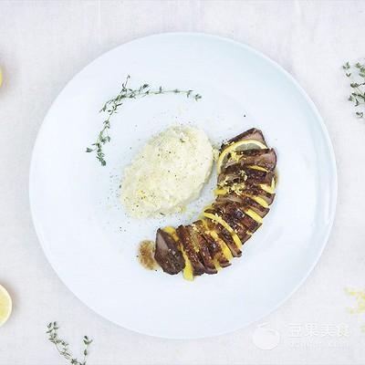 8、将鸭胸切片,间隔着柠檬片装盘,摆上配菜,最后淋几勺酱汁,这道柠汁烤鸭胸就大功告成了。