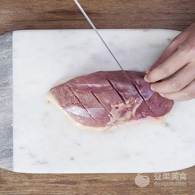 1、首先处理鸭胸:解冻后,在鸭皮表面切出十字花刀;翻个面,在鸭肉上也略切几刀,以便入味;