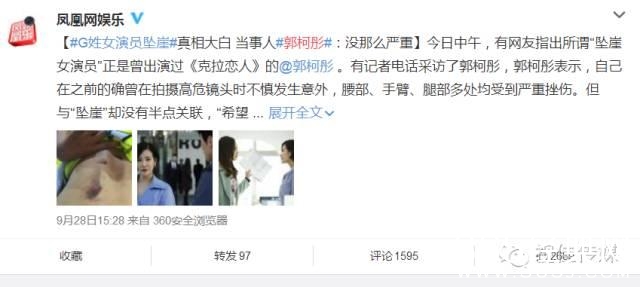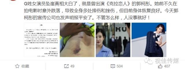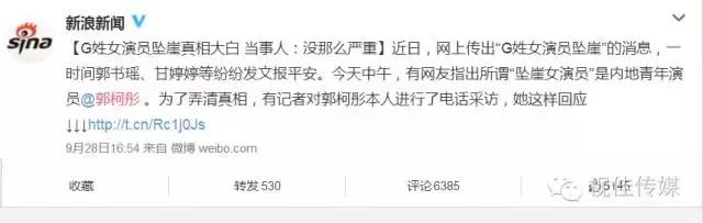 昨日娱乐圈涌出一条重大内幕消息“G姓女星坠崖。。。。。。”的新闻牵动了很多很多读者的神经,舆论导向将众多媒体的目光成功聚集到了一起,众多微博娱乐大V纷纷发出欲盖弥彰的内幕,粉丝纷纷进行猜测,连小编也义务发动人脉去找内情,结果今日早上一圈内朋友告知此人是郭柯彤,这和昨日小编调查的结果一致。我和大多数观众一样被弄得一头雾水,请原谅小编的无知,我知道这个87年出生的女生,却不知道她到底算是几线明星。