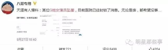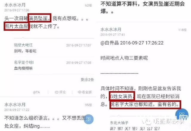 昨天晚上,微博开始流传一则消息:据天涯论坛上的网友爆料,国内某G星女星不幸坠崖,场面血肉模糊,被紧急送入医院。