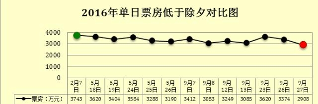 我们不要再期待国庆救市了,之前期待过端午档、暑期档、中秋档救市,然而在节日刚刚结束的时候,大盘不都是照样迅速跌进了谷底。2016年进入二季度以来,已经有超过13天的单日票房低于除夕冰点票房(见图-3),且9月份单日票房三度逼近3000万的冰点线。内地电影市场若继续这样发展下去,已近置于死地亦不为过。