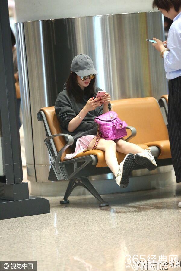 杨幂冒寒风将露腿进行到底 粉红百褶短裙吸睛翘双腿坐姿少女