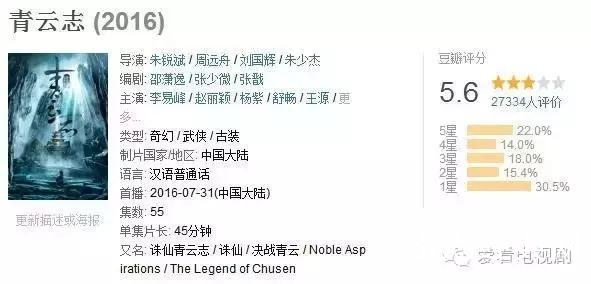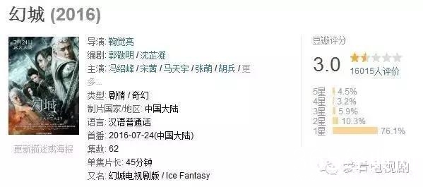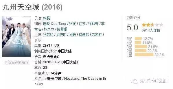 从豆瓣评分来看,《幻城》创造了豆瓣评分的最低值3.0分,《青云志》5.6分,《九州天空城》5.0分,《老九门》5.6分,《微微一笑很倾城》6.3分,《麻雀》稍高但也只有7.0分。