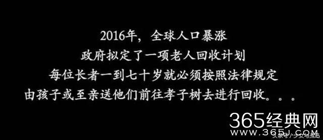 再说几个人谈笑风生,全然不像刚刚没了亲人的样子。更是以将家人送去孝子树为荣,连用老爸老妈命换来的孝子勋章都彼此羡慕不已。这些人的感情,已经无法单纯的用冷血来形容了。而在提到自己终有一天也会去孝子树的时候,他们则表现的很坦然,更像是制度下的悲哀产物。