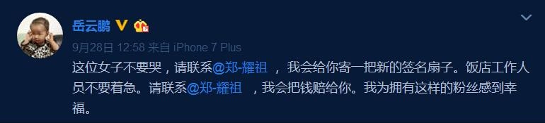 有人微博@岳云鹏,岳云鹏知道后表示都不要哭,一切责任我担着,我为有这样的粉丝感到骄傲。
