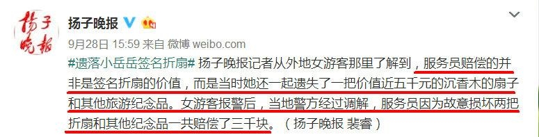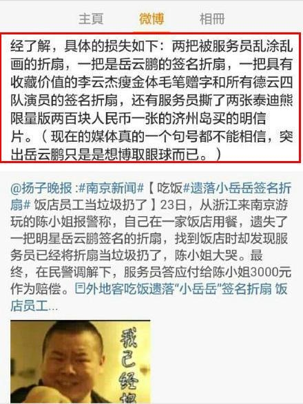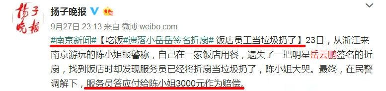 陈女士南京游玩,在一家饭店遗落折扇被服务员当垃圾扔掉,纸扇上有岳云鹏的签名照。